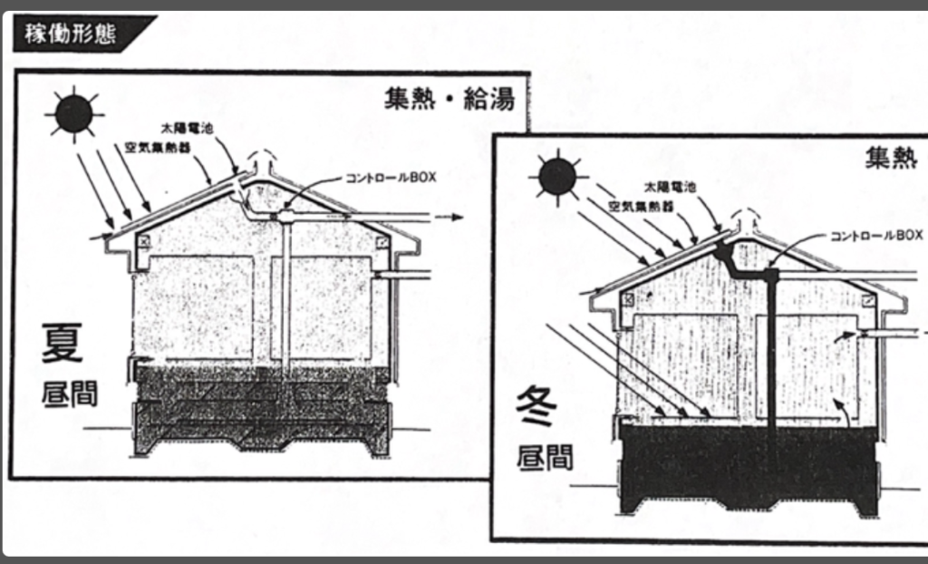 ②屋根に集熱器を取り付け、暖めた空気を太陽電池で動くファンで床下の音電層に送り、冬は家全体を暖める。ファンの駅動電源には、太陽電池を利用している。