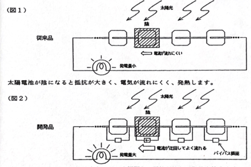 落葉や電柱などの部分的な陰による出力低下や、陰になった部分の温度上昇をおさえる。
