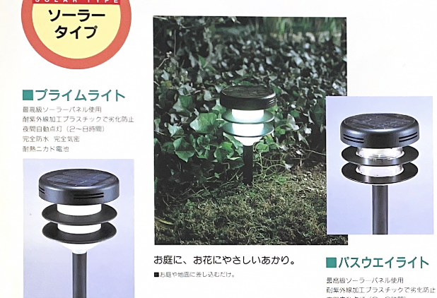 日中の太陽光をソーラーパネルから取り入れてニカド電池に蓄電し、夜間になると自動点灯する「ソーラータイプの照明器具」が発売されている。商品は、コードレスタイプのフットライト「プライムライト」や玄関・ガレージ等に利用できる「ソーラーセンサーライト」など4タイプ。