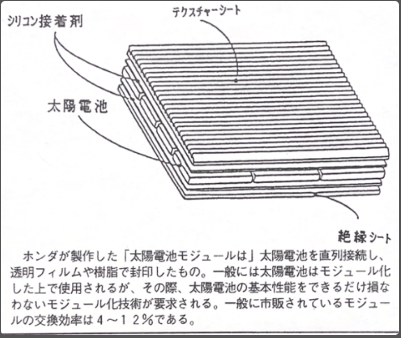 ホンダのモジュール化技術は、シリコン単結晶タイプの太陽電池を直列に高密度で接続し、シリコン系接着剤とアクリル樹脂でラミネートしている。表面を覆うラミネート材には特殊な溝がつけられたアクリル樹脂を使用しているが、この溝が太陽光の反射を低減する。さらに、一度モジュール内に入った光を外に逃がさないライトトラッピング構造(光り閉じ込め構造)も採用している。