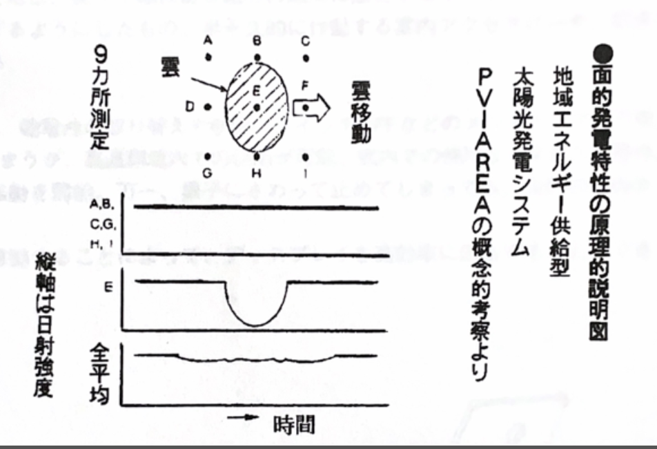 (※4) 例えば、一点に設置された太陽光発電システムは雲が掛かれば大きな影響を受けるが、システムが大量に普及し面的な設置がなされていた場合には、ある大きさの雲の移動に従って各観測点の日射強度が時間の経過と共に変動し、トータルとしては日照や需要を平約化する効果が得られる。