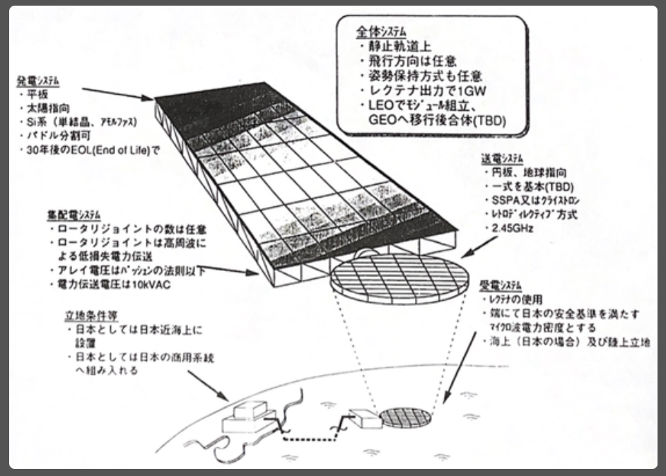 「宇宙太陽光発電」実用化の計画は日・米・仏で検討を重ねているが、石油危機を契機に米国が、横5kmX縦10kmの発電衛星60基で全米の総電力をカバーしようという構想を立てたこともあった。しかし、20兆円という巨額な費用を必要としたため棚上げされた。今回我が国が国家計画として実験に着手すれば、世界で初めてのことであった。